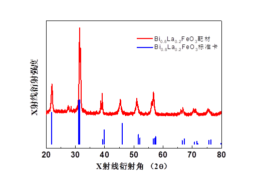 1.陶瓷靶材制备方法:采用百分之99.9纯度Bi2O3、百分之99.9纯度 Fe2O3粉末、百分之99.9纯度La2O3粉末,按化学计量比配料,球磨混合均匀,在大于800度下通过固相烧结制备靶材。